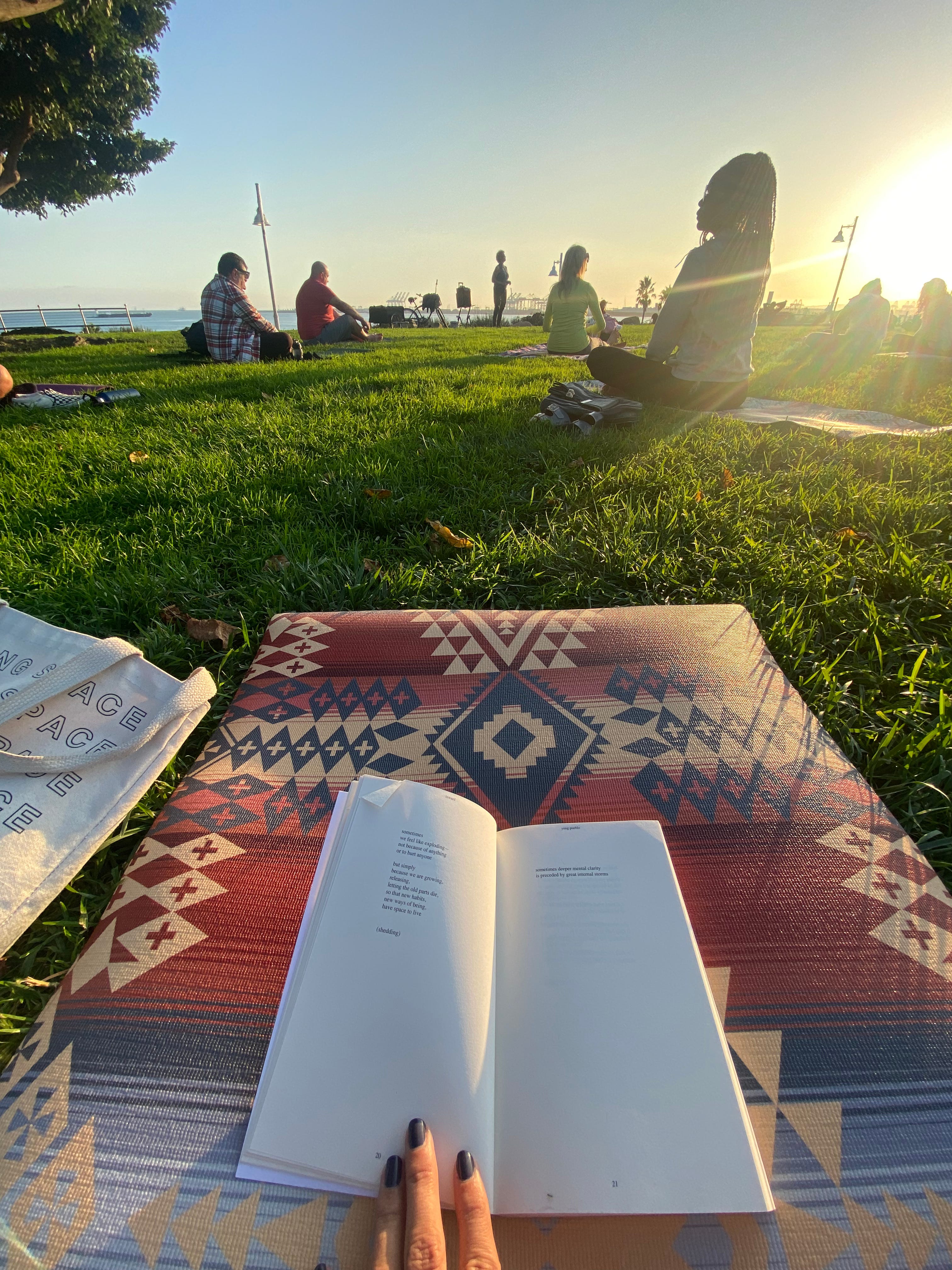 I made it a habit to take the book with me to my evening yoga classes outside on the bluff here in Long Beach (it’s slim and perfectly sized for a tote bag). Before class started, I would roll out my mat, settle in, and read a few pages. There would always be one or two that struck a chord, and I would use them as inspiration for my practice. My copy is now lovingly grass-stained and full of dog ears (editor’s note: I am generally opposed to dog-earing and insist on using a bookmark or a receipt but in this case, I love to be able to quickly flip to my favorite passages and revisit them). Then, lo and behold, Yung Pueblo’s Substack appeared in my feed. Then he announced a book tour for his new book The Way Forward, with a stop in Los Angeles. The Los Angeles stop also happened to be hosted by Yoga With Adrienne, another longtime favorite of mine. It’s funny how the universe works sometimes, isn’t it? I bought two tickets for the event and hoped that I’d be able to find a friend to accompany me.