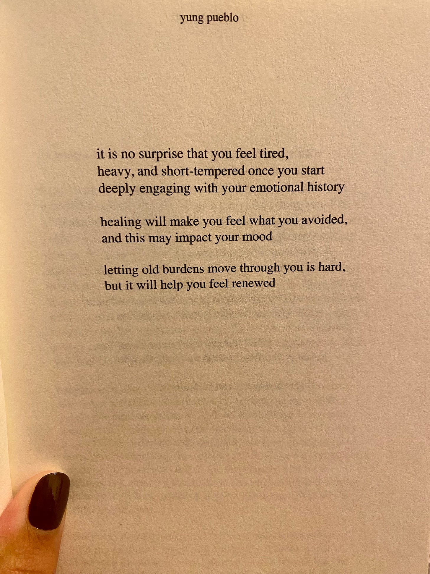 I have gotten a LOT of book recommendations over the past couple months (if you’ve sent me one, thank you!). My ‘to-read’ pile in my nightstand is teetering frighteningly high, but one can only process so much self-help knowledge without spontaneously combusting and meanwhile my latest fantasy novel is calling my name and alas, it’s going to take me awhile to get through them all. But one book I have read in its entirety (practically twice at this point) is Yung Pueblo’s Inward. It appeared in the mail one day, sent by my dear cousin Maggie, who is one of my favorite people and role models. I was somewhat familiar with Yung Pueblo’s work, after all I’m a girl in her mid-30s who spends too much time on Instagram and is a sucker for catchy quotes, but I had never sat down with one of his books. (I also strongly believe that books find you at the right time.) It could technically be described as poetry, but there’s no flowery imagery or vague metaphors. Instead, it’s 224 pages of wisdom, broken down into little bite sized chunks. Some pages have only a line or two, others a few stanzas, while some have shorter snippets of prose. It’s an incredibly accessible style of writing; anyone could pick it up, read a few pages and walk away a bit lighter.